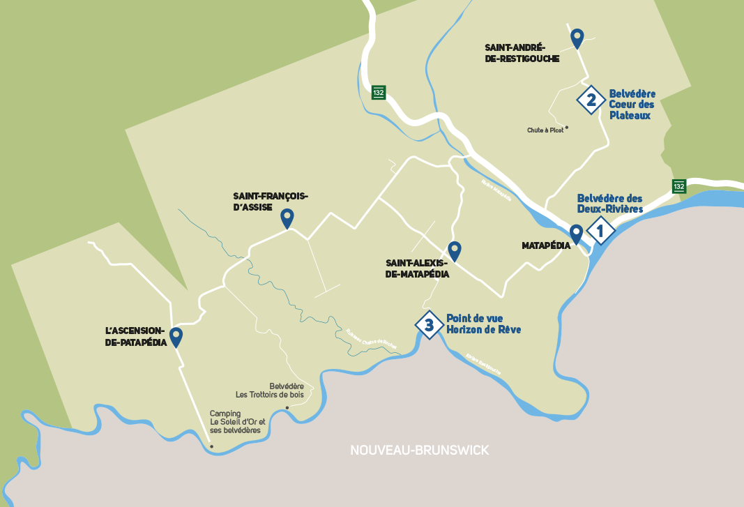 La Route des belvédères est en cours de déploiement dans la région de Matapédia-et-les-Plateaux. À la croisée des chemins vers la Baie-des-Chaleurs, le Nouveau-Brunswick et la Vallée de la Matapédia, cette région forme la partie ouest de la MRC d’Avignon, dans le sud-ouest de la Gaspésie. Regroupant les municipalités de Matapédia, de Saint-André-de-Restigouche, de Saint-Alexis-de-Matapédia, de Saint-François-d’Assise et de L’Ascension-de-Patapédia, elle se distingue par ses paysages époustouflants de monts et rivières.